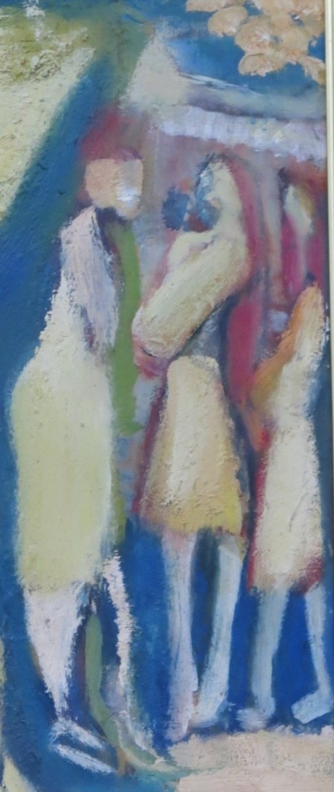 Le dernier groupe de trois personnages, à droite du tableau, est beaucoup plus coloré. Ils sont vus de profil, deux sont en conversation. Leurs têtes sont des miniatures de signes colorés et concrets. Remarquez le jeu expressif et gratuit de leurs jambes. Chacun a son attitude corporelle. Le ruban vert d'une écharpe se déroule du cou au sol et se joue des jambes.Cette frise colorée a quelque chose de médiéval.